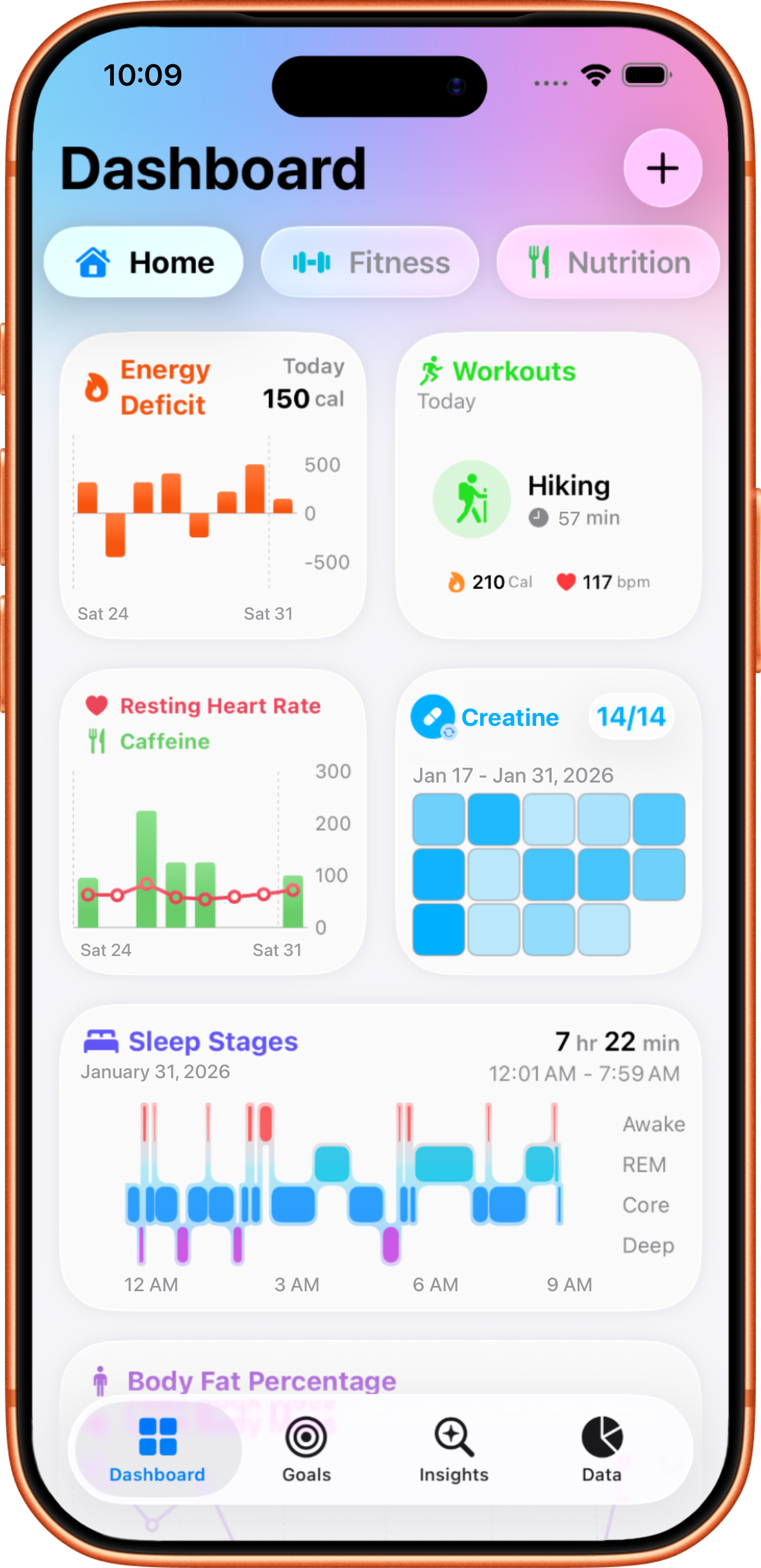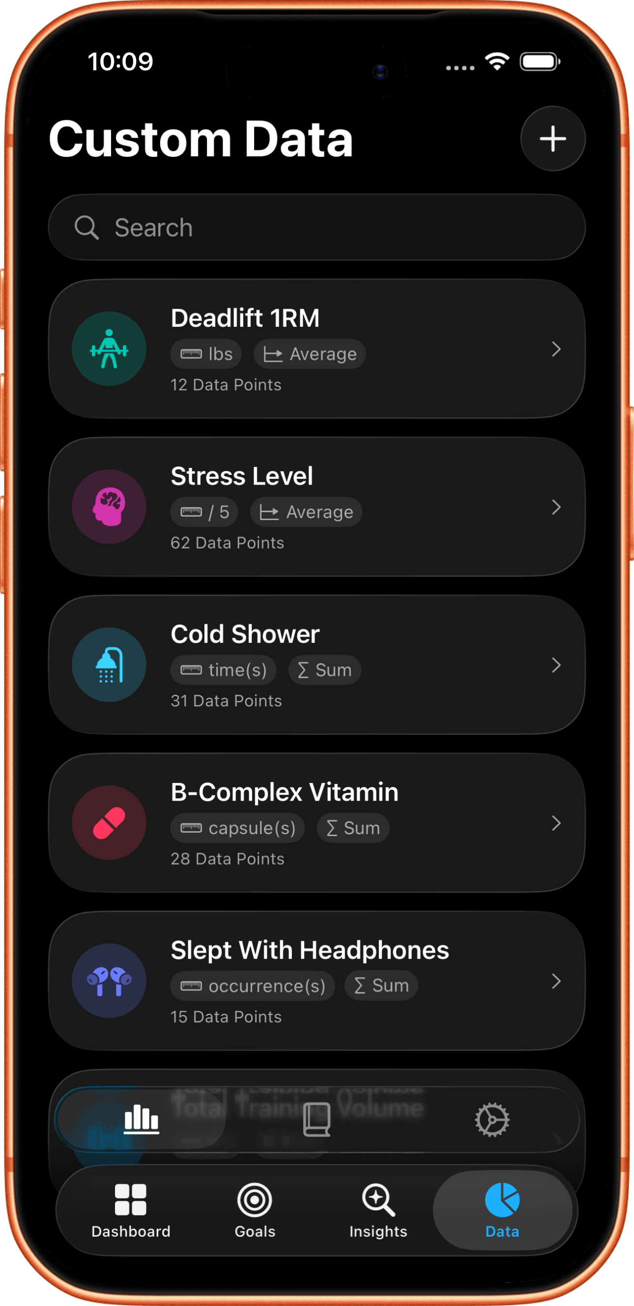 In addition to the over 200 supported data types from the Health app, Coefficients allows you to create custom data types to track your supplements, symptoms, habits, protocols, outcomes, and much more, all in one place.